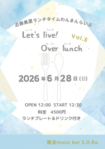 LIVE Information Next Live 2026.6.28.sun. 近藤美里ランチタイムわんまんらいぶ【Let's live! Over lunch vol.5】 Place:大阪 難波music bar S.O.Ra.Act:近藤美里 open 12:00/start 12:30Chage:ADV.¥4,500ランチプレート&ドリンク付き 大阪 難波music bar S.O.Ra. ご予約フォーム